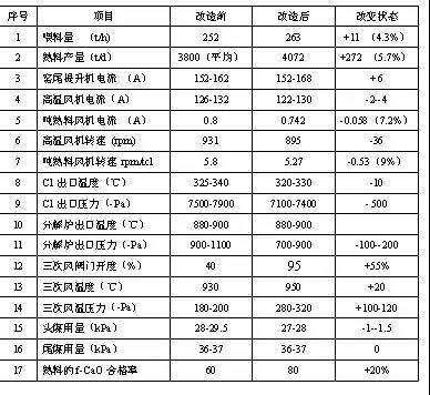 帶預(yù)燃爐的2500t/d生產(chǎn)線優(yōu)化改造前后運(yùn)行參數(shù)對比:
