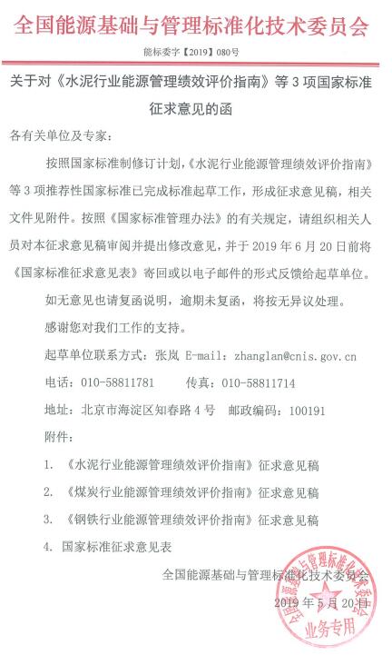 水泥人網從中國標準化研究院網站獲悉,關于對《水泥行業能源管理績效評價指南》等3項國家標準征求意見的函,詳情如下: