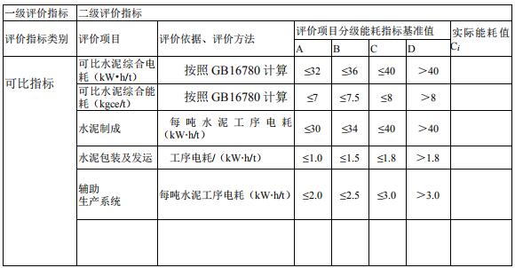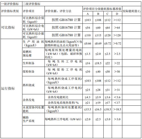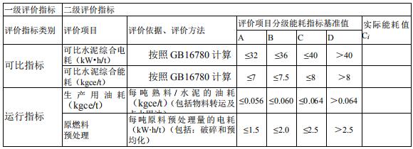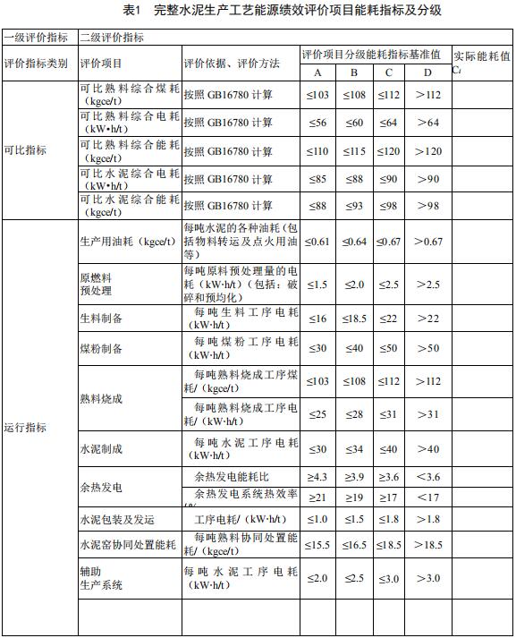 表1 完整水泥生產工藝能源績效評價項目能耗指標及分級