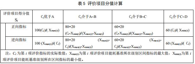 注:Ci 為第 i 項評價指標的實際數值;Xmax(i)為第 i 項評價項目能耗基準所在級別區間指標的最大值;Xmin(i)為第 i項評價項目能耗基準級別所在區間指標的最小值。