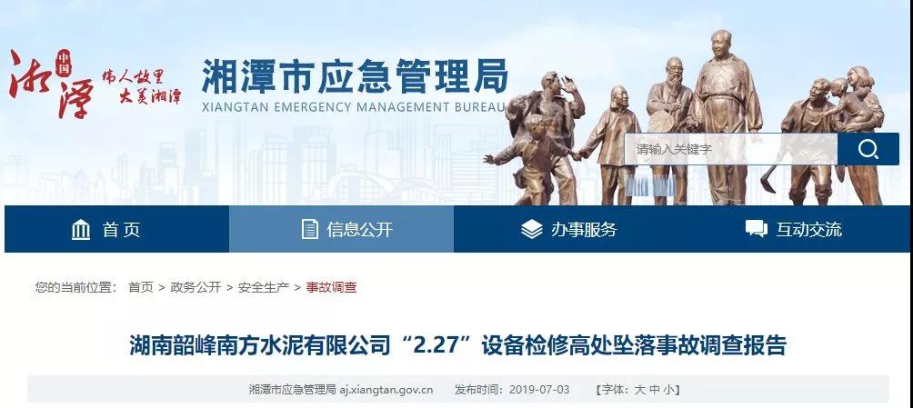 2019年2月27日10時50分左右,湖南韶峰南方水泥有限公司委托湘鄉韶峰機電工程有限公司對生產設備(5000T/D窯頭電修塵廢氣管道)進行檢修過程中,發生一起高處墜落事故,造成1人死亡1人受傷,直接經濟損失167萬余元。
