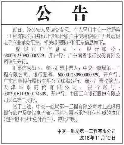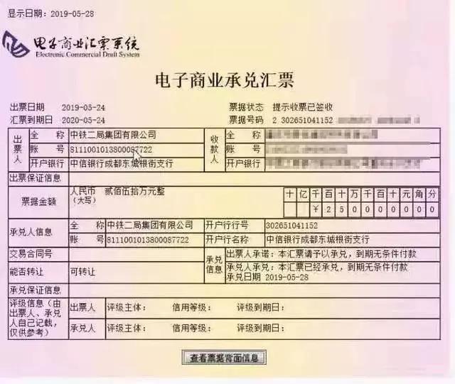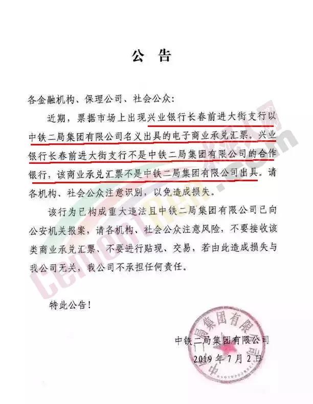 并且中鐵二局公司已經(jīng)向公安機關報案,請各機構、社會公眾注意風險,不要接收該類商業(yè)承兌匯票、不要進行貼現(xiàn)、交易,造成的損失中鐵二局不承擔責任。 說白了這票和中鐵二局沒有關系,到期可能無法兌付。