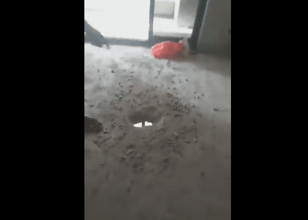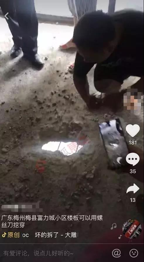 從視頻中可見,該事件發(fā)生在梅州富力城第4期22棟803號(hào)房,業(yè)主僅用一把螺絲刀便可以輕松刮開地板上的水泥,捅出一個(gè)窟窿,水泥毫無強(qiáng)度、韌性、穩(wěn)定性可言,鋼筋也是相當(dāng)細(xì),根本無法想象這可以保證樓上、樓下兩家人的日常生活安全。