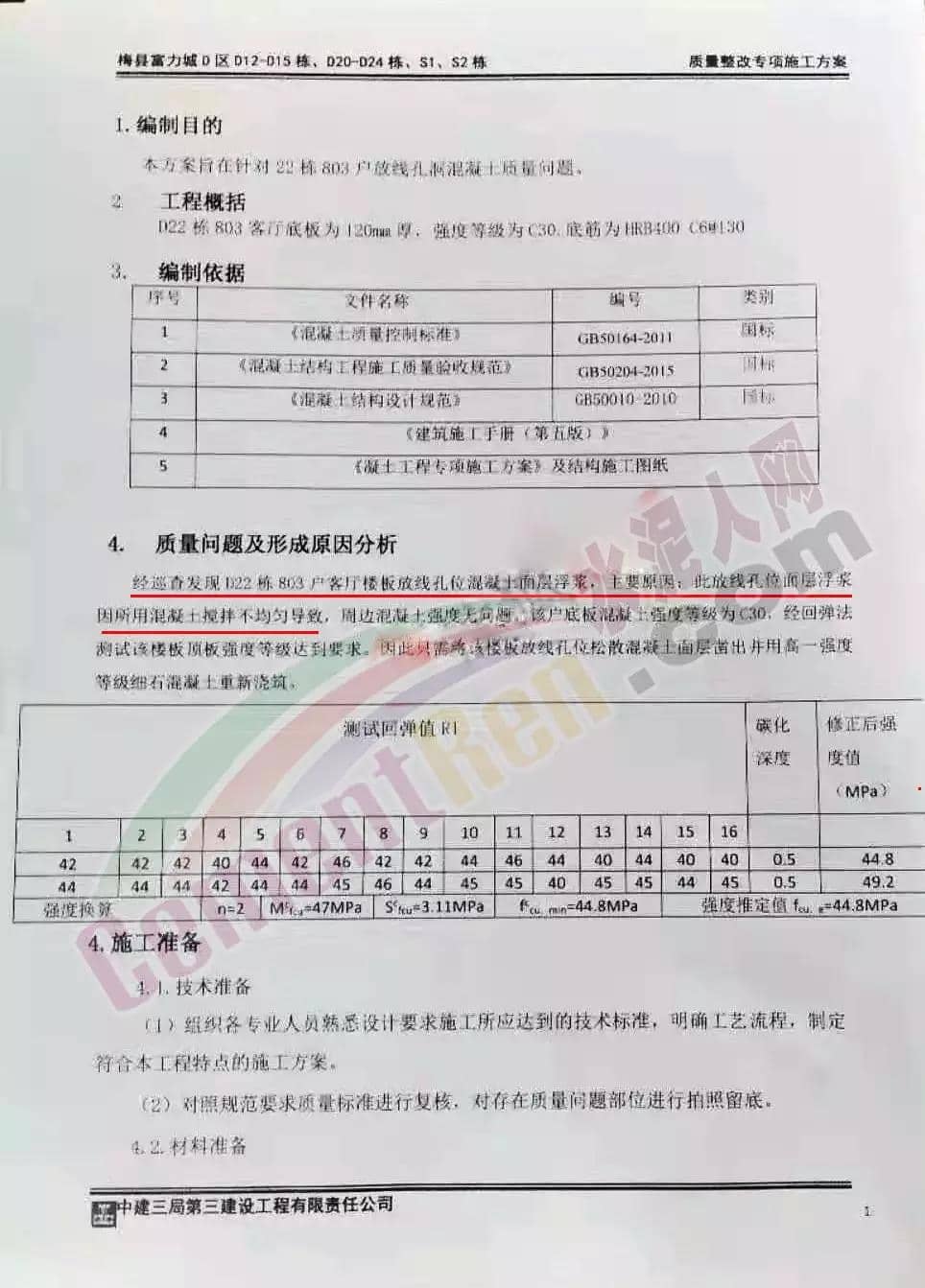 該質(zhì)量整改項(xiàng)施工方案中指出:經(jīng)巡查發(fā)現(xiàn)D22棟803戶客廳樓板放線孔位混凝土面層浮槳因所用混凝土攪拌不均勻?qū)е拢苓吇炷翉?qiáng)度無問題,一句輕描淡寫的話就給此事劃上了句號(hào)。