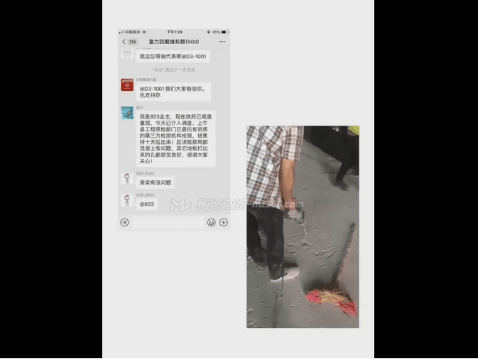 據(jù)梅州富力城4期初業(yè)主表示:昨晚該視頻在微信群傳開了,出于對(duì)自身房屋的擔(dān)憂,還特意去檢測(cè)了下自己的房子,幸好沒發(fā)現(xiàn)問題。“可能是不同時(shí)期建造的房子,混凝土質(zhì)量不一樣。” 該業(yè)主表示。