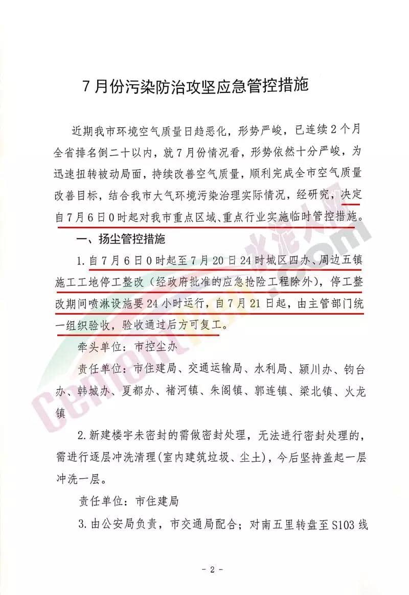 通知明確要求,禹州市全市石料加工、水泥企業(粉磨站工序)、粉磨站企業及城市規劃區內的耐材、鑄造、陶瓷等企業自7月6日0時起錯峰停產停售至7月20日24時,復工時間另行通知,各單位按照重污染管控要求安排“三員”入住監督。