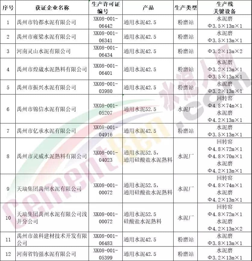 禹州市部分水泥企業名單