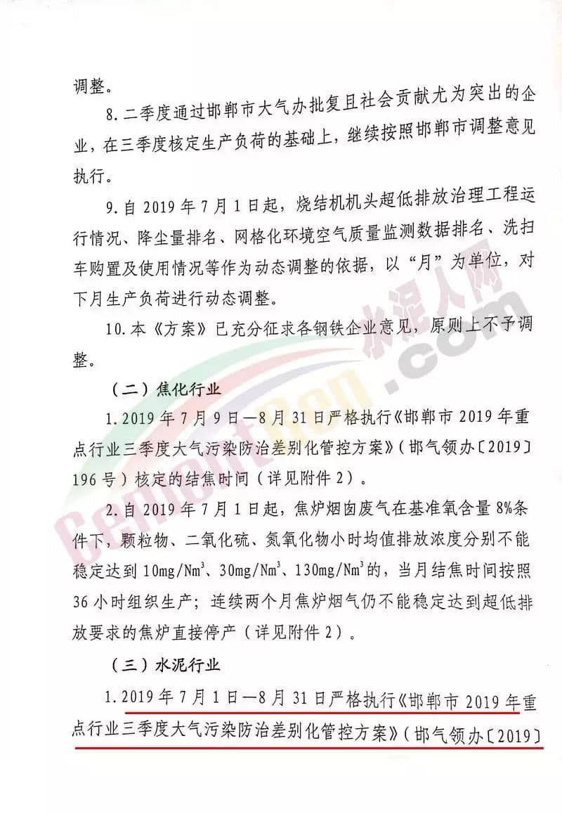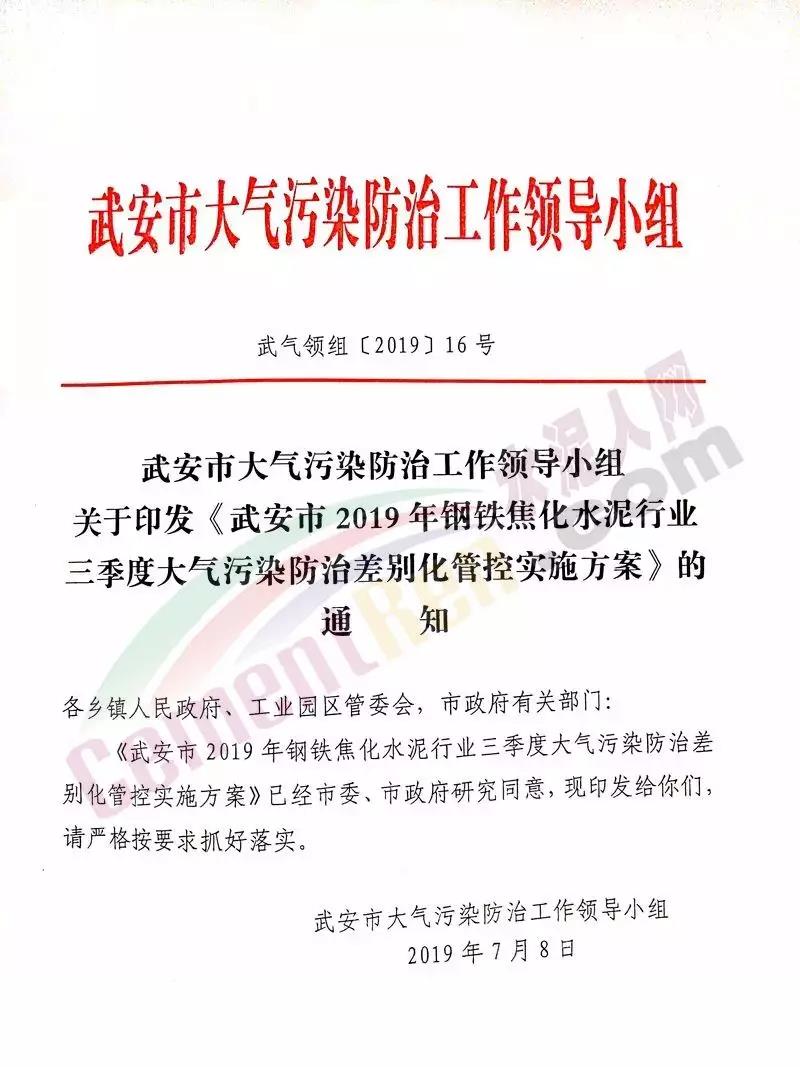 水泥人網(wǎng)消息:7月8日,武安市政府印發(fā)《武安市2019年鋼鐵焦化水泥行業(yè)三季度大氣污染防治差別化管控實(shí)施方案》的通知。要求在7月1日-8月31日期間,全市14家鋼鐵、6家焦化及2家水泥企業(yè)按照要求執(zhí)行錯(cuò)峰停產(chǎn)政策,9月份結(jié)合本市的空氣質(zhì)量和氣象條件再另行制定管控方案。方案原文如下: