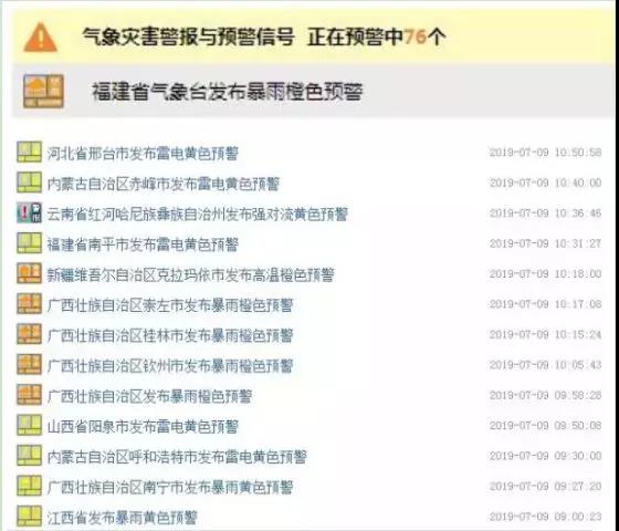 南方各地也紛紛拉響了氣象災害警報與預警信號!7月9日,氣象災害預警達到76個,超過95%為暴雨或雷電預警。
