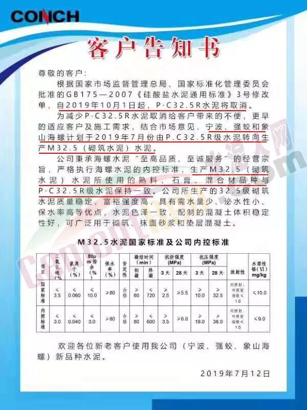 為減少P.C32.5R水泥取消給客戶帶來的不便,更早的適應(yīng)客戶及施工需求,結(jié)合市場意見,寧波、強(qiáng)蛟和象山海螺計(jì)劃于2019年7月份由P.C32.5級水泥轉(zhuǎn)向生產(chǎn)M32.5(砌筑水泥)水泥。