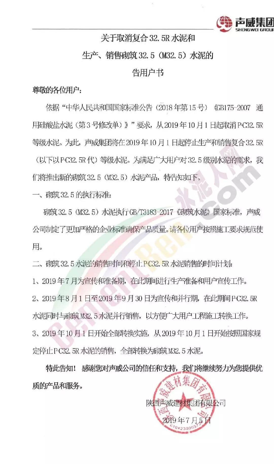 陜西聲威集團(tuán)的告用戶書稱:根據(jù)“中華人民共和國國家標(biāo)準(zhǔn)公告(2018年第15號)《GB175-2007通用硅酸鹽水泥(第3號修改單)》”要求,從2019年10月1日起取消PC32.5R等級水泥。為此聲威集團(tuán)將在2019年10月1日起停止生產(chǎn)和銷售復(fù)合32.5R(以下以PC32.5R代)等級水泥。為滿足廣大用戶對32.5級別水泥的需求,聲威集團(tuán)將推出新的砌筑32.5(M32.5)水泥產(chǎn)品。