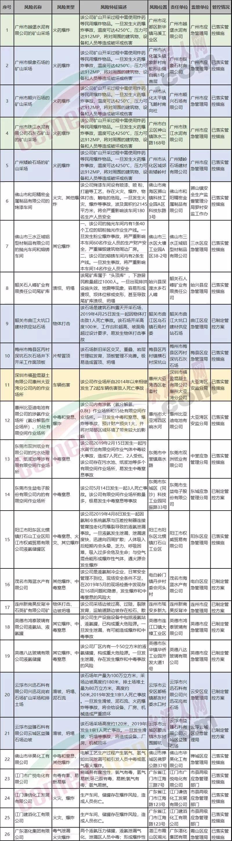 水泥人網(wǎng)消息:昨日(7月12日)廣東省應(yīng)急管理廳發(fā)布《危險(xiǎn)化學(xué)品、工礦商貿(mào)行業(yè)領(lǐng)域重大風(fēng)險(xiǎn)管控掛牌警示》其中風(fēng)險(xiǎn)類型為火藥爆炸的風(fēng)險(xiǎn)名稱包含廣州市越堡水泥有限公司的礦山采場和廣州市珠江水泥有限公司石灰石礦山的礦山采場兩家水泥企業(yè)礦山采廠以及廣州市銀象石場的礦山采場、廣州市順興石場的礦山采場、廣州矮嶺石場的礦山采場三家采石場 。