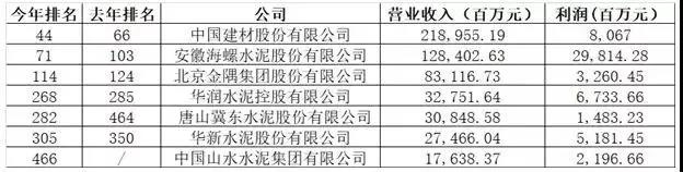 查看榜單得知,與去年排名相比,七家水泥企業今年的排名都有所上升。排名上升最快的是唐山冀東水泥,較去年排名上升了182位。值得一提的是,去年未入榜的中國山水水泥今年成功進入榜單,排名第466位。