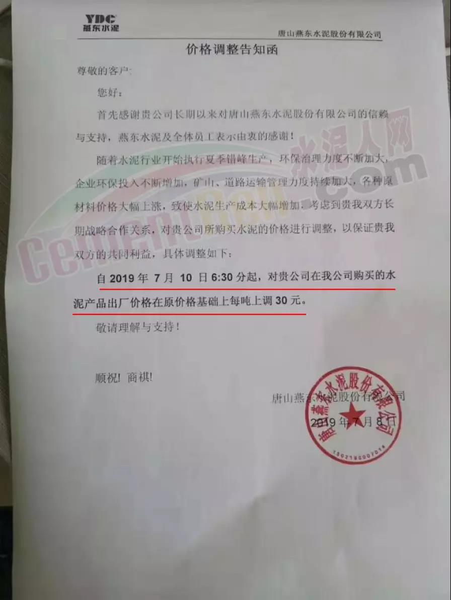 唐山燕東水泥發(fā)布《價(jià)格調(diào)整告知函》稱(chēng):隨著水泥行業(yè)開(kāi)始執(zhí)行夏季錯(cuò)峰生產(chǎn),環(huán)保治理力度不斷加大,企業(yè)環(huán)保投入不斷增加,礦山道路運(yùn)輸管理力度持續(xù)加大,各種原材料價(jià)格大幅上漲,致使水泥生產(chǎn)成本大幅增加,因此對(duì)產(chǎn)品價(jià)格做出調(diào)整。具體調(diào)整為,自2019年7月10日06:30起,水泥產(chǎn)品出廠價(jià)格在原價(jià)格基礎(chǔ)上,每噸上調(diào)30元。