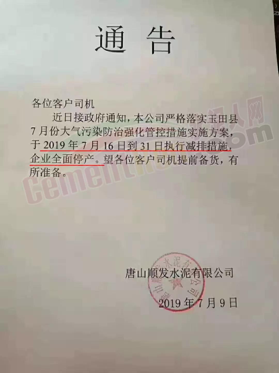 唐山順發(fā)水泥有限公司通知稱(chēng):近日接到政府通知,本公司嚴(yán)格落實(shí)玉田縣7月份大氣污染防治強(qiáng)化管控措施實(shí)施方案,于2019年7月16日到31日?qǐng)?zhí)行減排措施,企業(yè)全面停產(chǎn)。望各位客戶(hù)司機(jī)提前備貨,有所準(zhǔn)備。