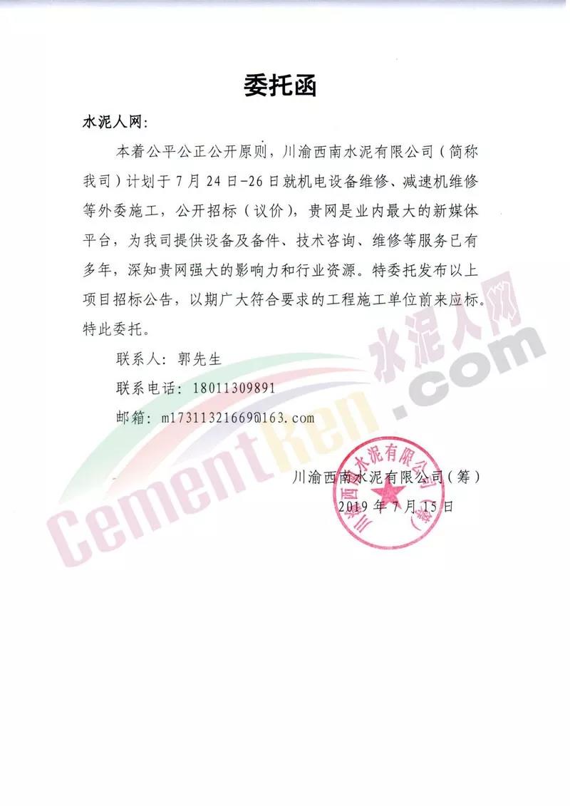 川渝西南公司擬對下屬的四川區域、重慶區域39家熟料、水泥生產企業,進行2019年度機電設備維修、減速機維修等外委施工招議標,通過公開邀請招標選擇資質合格、保供能力強、質量及技術服務均受控的供貨單位。現將相關招標采購信息發布如下:
