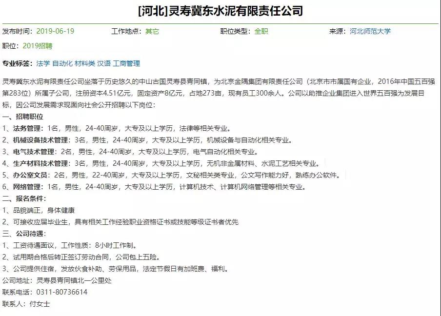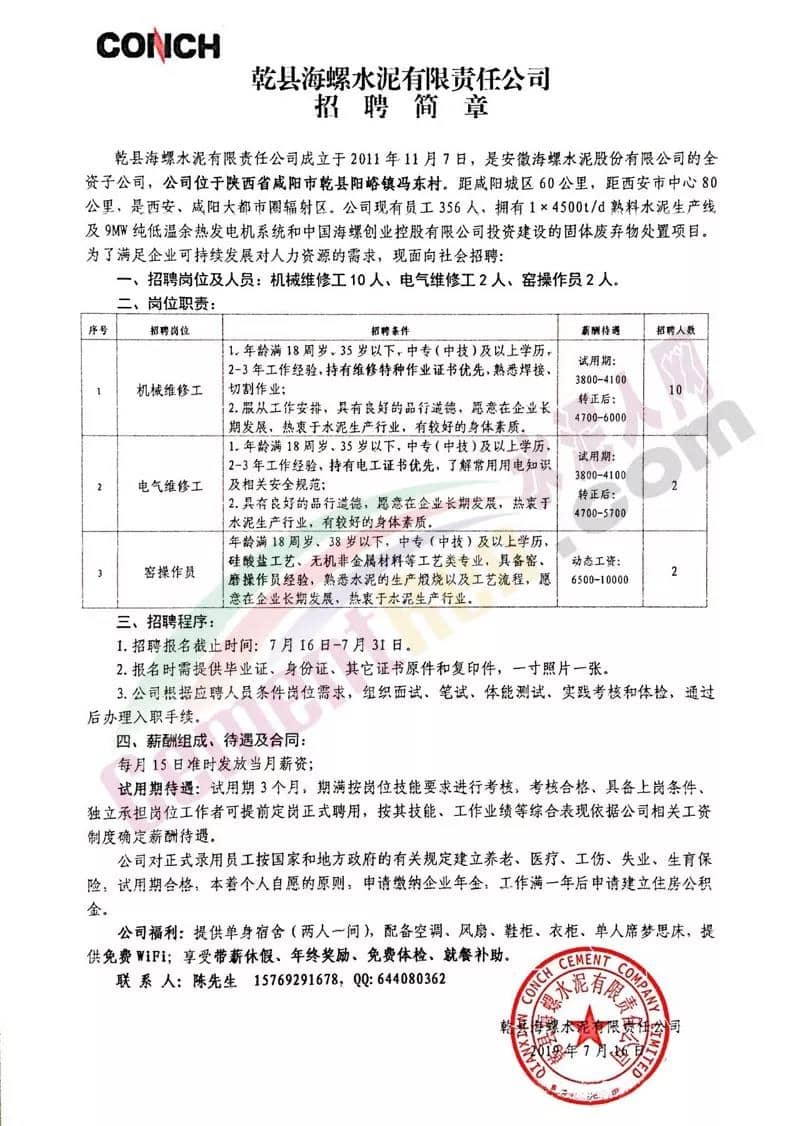工作地址:銅川耀州區冀東水泥廠、鳳翔田家莊冀東水泥廠、扶風天度鎮冀東水泥廠、涇陽王橋鎮冀東水泥廠,可就近安排工作。