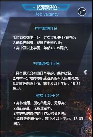 要求:男,中專、高中以上學歷;電氣相關專業或有電工證、有實際工作經驗者。年齡18-45歲。工資待遇:3500- 4500元/月。