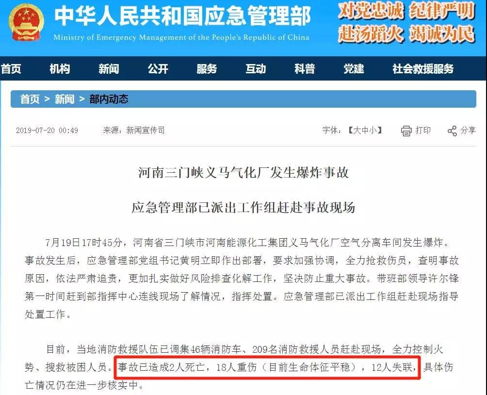 記者從三門峽市委宣傳部了解到,爆炸事故已造成2人死亡,12人失聯(lián),重傷18人(目前生命體征平穩(wěn))。