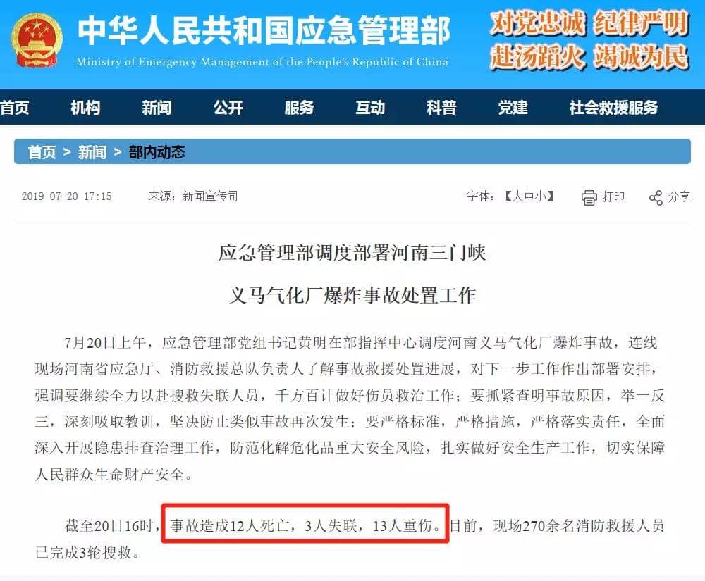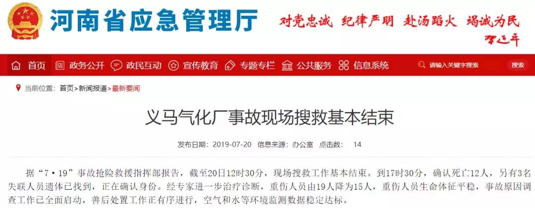 到17時30分,確認死亡12人,另有3名失聯(lián)人員遺體已找到,正在確認身份。經(jīng)專家進一步治療診斷,重傷人員由19人降為15人,重傷人員生命體征平穩(wěn),事故原因調(diào)查工作已全面啟動,善后處置工作正有序進行,空氣和水等環(huán)境監(jiān)測數(shù)據(jù)穩(wěn)定達標。