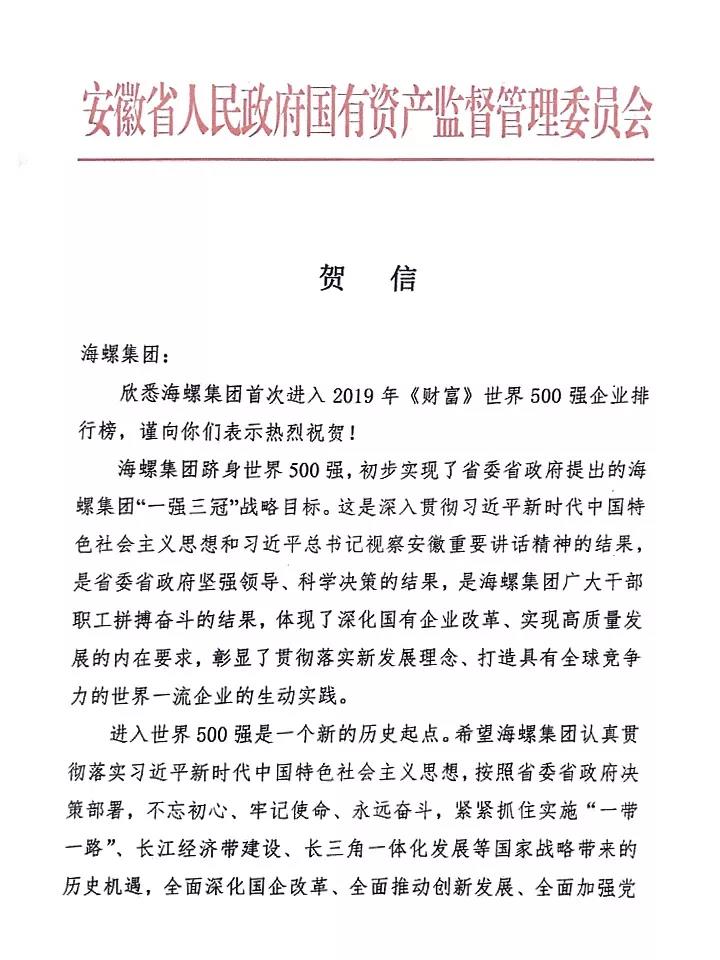 安徽省人民政府網(wǎng)、安徽日報、人民網(wǎng)安徽、中新社安徽、中安在線等主流媒體紛紛發(fā)布海螺進入世界500強消息報道。安徽省國資委專門向海螺集團致賀信。