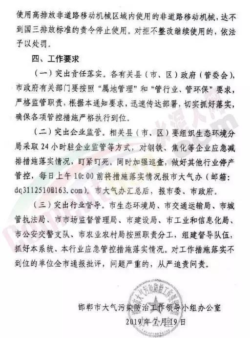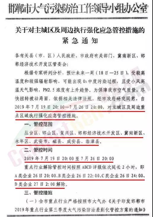同期,邯鄲市大氣污染防治工作領(lǐng)導(dǎo)小組辦公室也發(fā)布了緊急通知,邯鄲市于2019年7月19日20.00-7月26日20:00,對(duì)主城區(qū)及周邊執(zhí)行大氣污染防治強(qiáng)化應(yīng)急管控措施。管控地區(qū)包括邯山區(qū)、復(fù)興區(qū)、邯都經(jīng)濟(jì)技術(shù)開發(fā)區(qū)、冀南新區(qū)、永年區(qū)、武安市、磁縣、成安縣、臨潭縣。