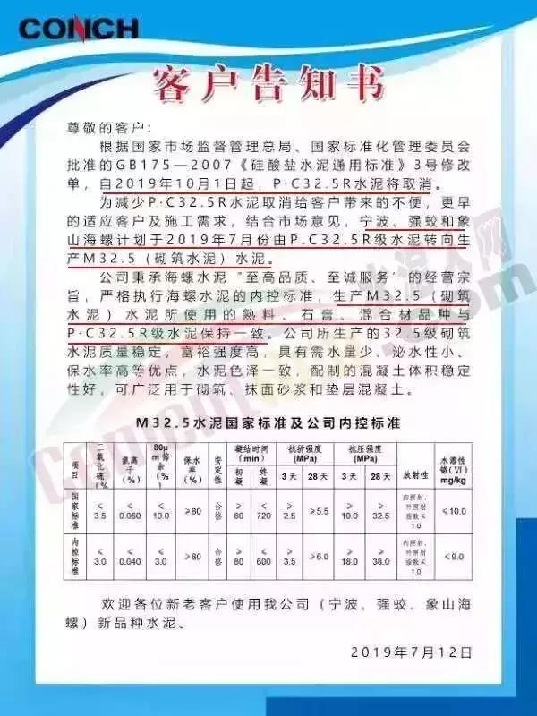 此前,浙江區域海螺水泥發布客戶告知書稱根據國家市場監管總局、國家標委會批準GB175-2007《硅酸鹽水泥通用標準》3號修改單,自2019年10月1日起,P.C32.5R水泥將取消。