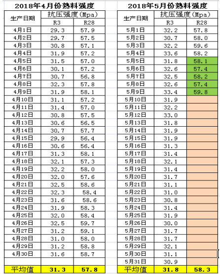 下圖為2018年4月和5月出窯熟料率值及f-CaO合格率: