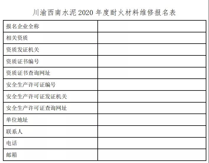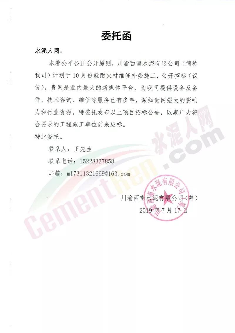 川渝西南水泥有限公司(籌)是西南水泥有限公司的旗下子公司,公司目前在運行的新型干法窯有 39 條。現面向社會統一對回轉窯系統耐火材料 2020 年度維修施工工程進行招標。
