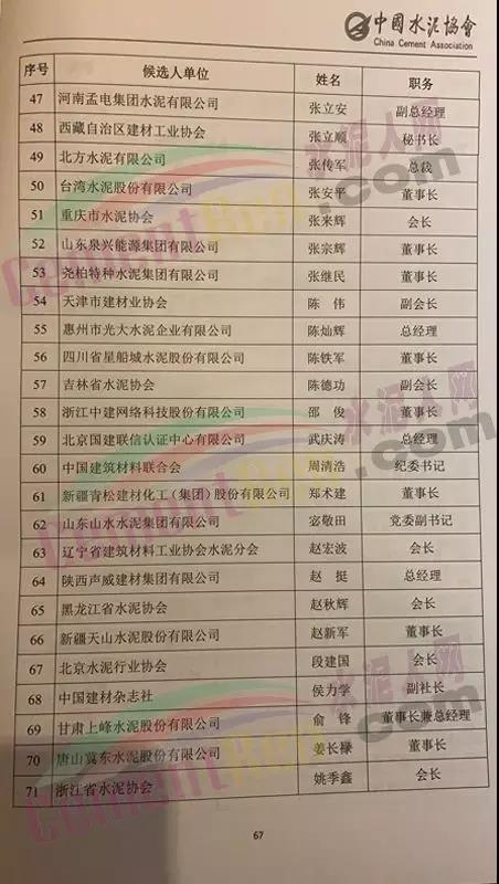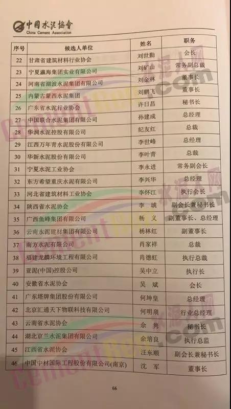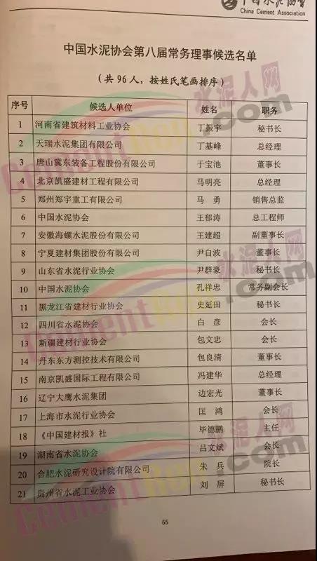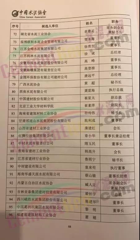 水泥人網(wǎng)消息,中國水泥協(xié)會第八次會員代表大會暨 2019 年中國水泥 50 強高層論壇于昨日(24日)在安徽蕪湖海螺大酒店隆重召開。在本次會議中,中國水泥協(xié)會總工程王郁濤、安徽海螺水泥股份有限公司副董事長王建超、丹東東方測控技術(shù)有限公司董事長包良清、湖南省水泥協(xié)會會長呂文斌、唐山冀東裝備工程股份有限公司董事長于寶池、華新水泥股份有限公司董事長李葉青、南方水泥有限公司總裁肖家祥等96人加入第八屆中國水泥協(xié)會常務(wù)理事。詳細(xì)名單如下: