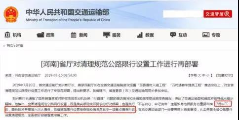 7月中下旬,國務院將開展第六次大督查,河南省道路限行設置排查整改情況是其中一項重點督查內容,在會議中,也明確表示將對違規限高設施進行清理,并強化公路限行設置的審批把關。各地交通運輸主管部門要會同相關部門開展聯合執法,9月底前清理完違規限高限寬設施,嚴控農村公路限高限寬設施數量。