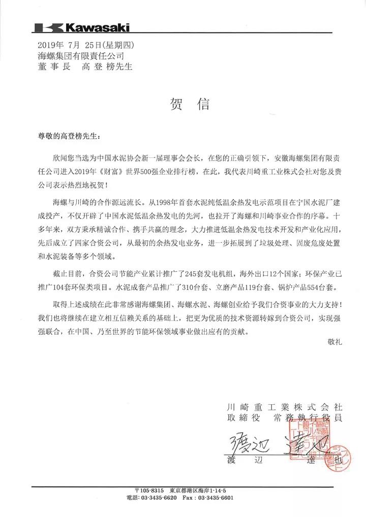 7月22日,海螺集團榮登財富世界500強企業榜單。水泥人網第一時間做了相關報道。7月25日,海螺集團董事長高登榜當選中國水泥協會新一屆理事會會長,水泥人網行業總監張蘭第一時間向高登榜董事長表示祝賀。 近日,池州市人民政府,中國建筑材料聯合會、中國水泥協會,泛太平洋集團、三一集團、日本川崎重工等企業向海螺集團發來賀信。 池州市人民政府 中國建筑材料聯合會 中國水泥協會 泛太平洋集團 三一集團 日本川崎重工 寧波工業投資集團 海螺創業 海創投資
