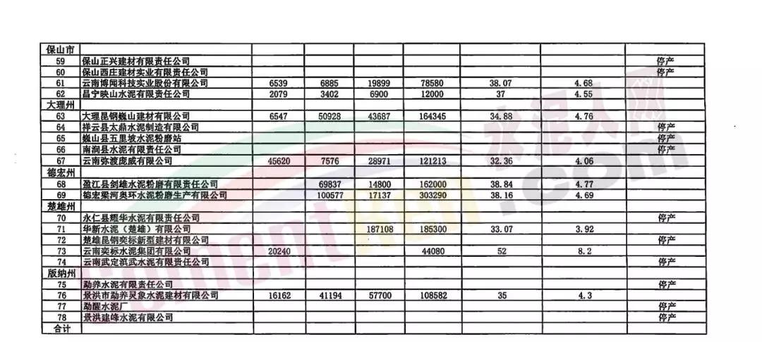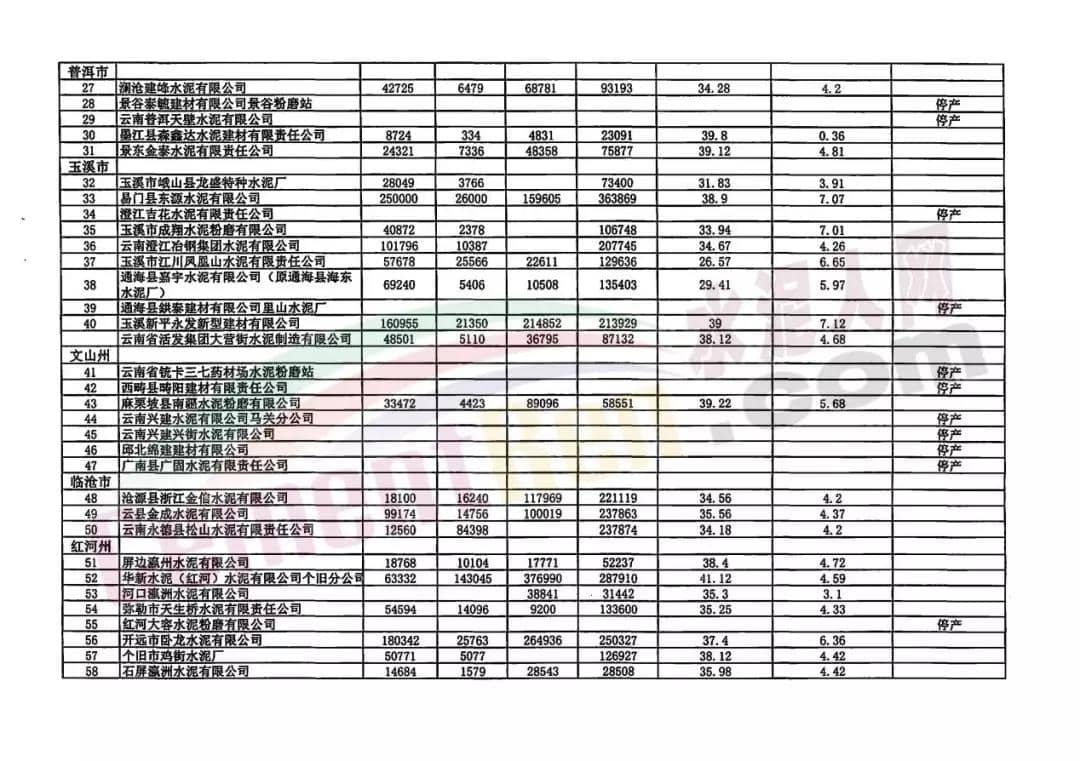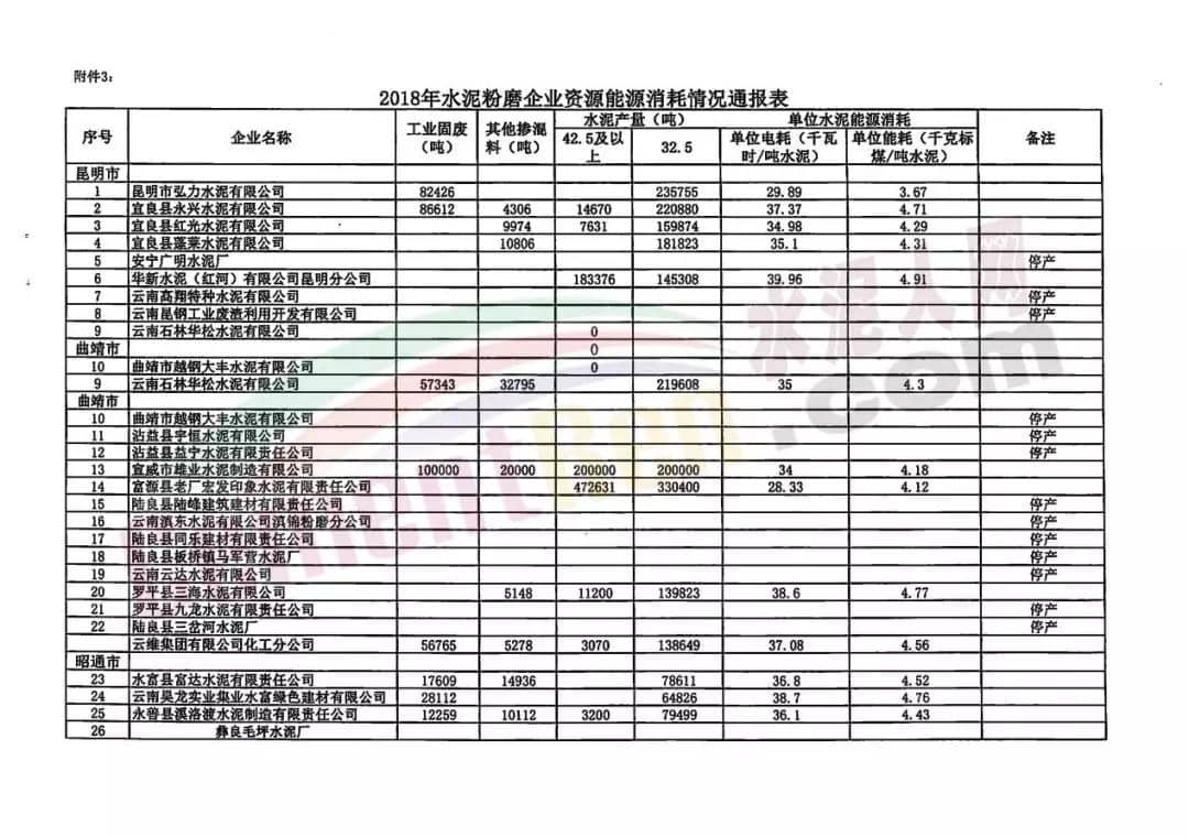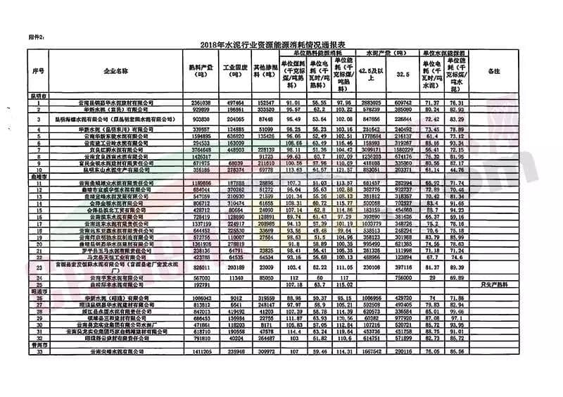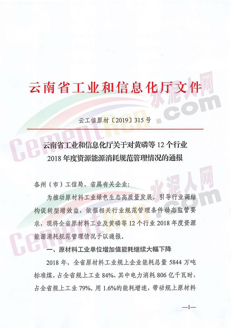 水泥人網消息:近日,云南省工業和信息化廳頒布《云南省工業和信息化廳關于對黃磷等12個行業2018年度資源能源消耗規范管理情況的通報》稱:為推動原材料工業綠色生態高質量發展,引導行業調結構促轉型增效益,依據相關行業規范管理條件動態監管要求,現將云南省原材料工業及水泥等12個行業2018年資源能源消耗規范管理情況予以通報。