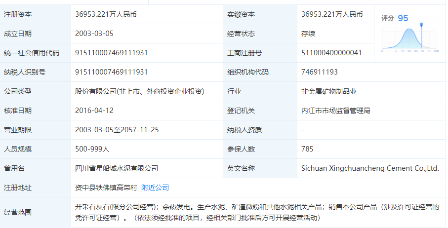 天眼查相關(guān)數(shù)據(jù)顯示:企業(yè)注冊地址位于資中縣鐵佛鎮(zhèn)高榮村,經(jīng)營范圍為開采石灰石,余熱發(fā)電,生產(chǎn)水泥,礦渣微粉和其他水泥相關(guān)產(chǎn)品。