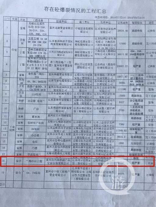 19個項目中,西郊農副產品交易市場屬較為嚴重情形。受訪者供圖,三木建材簽約時疑無生產資質此外,記者梳理發現,19個項目中還涉及5處住宅項目,其中一處為拆遷安置房。目前除西郊農副產品交易市場外,大部分項目已通過修復、退房等方式解決了遺留問題。另外,記者注意到,宜興市三木建材有限公司與江蘇鴻宇建筑安裝工程有限公司合同簽訂時間為2014年9月23日,但在宜興市住建局建設工程質量監督站提供的由無錫市建設局發放的《建筑業企業資質證書》上卻標注,宜興市三木建材有的公司取得生產資質的時間為2014年10月24日。對此,宜興市住建局建設工程質量監督站相關負責人程冰表示,在此之前宜興市三木建材有限公司是有預生產資格的。一般對混凝土檢測只是根據國家規定進行強度測試,多次檢測過程中均顯示合格,且目前國家并無混凝土中不允許摻雜鋼渣的規定。“當時該企業給我們上報成分時并未標注有鋼渣成分,而且據我們調查,企業不是在所有批次中均添加鋼渣。且由于鋼渣中存在游離成分,放置時間長的也就揮發掉了,沒有揮發的游離成分被添加在混泥土中,遇水則發生了氧化反應。其氧化和爆裂的時間也是無法確定的。”程冰解釋。而對于為何在混凝土中添加鋼渣,此前,宜興三木建材有限公司負責人繆幸福在接受媒體采訪時稱,28天的石塊反應期內并沒有出現過爆裂現象。在混凝土中添加廢鋼渣是不少混凝土企業的常用手法,且其發現將廢鋼渣添加到混凝土中后會增加其硬度,因此才將廢鋼渣當做粗骨料與石子一起添加到混凝土中使用。而對于出現問題后如何處理,繆幸福稱還在等待權威部門的鑒定結果,而這一等就是4年時間。