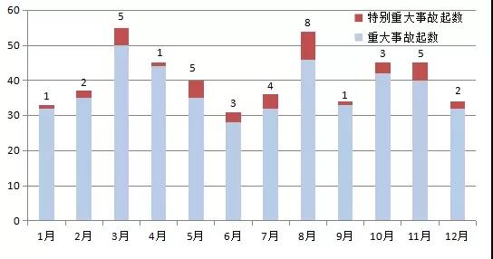 其中,特別重大事故在近十年的8月份發(fā)生最為集中,共發(fā)生8起、死亡480人,占近十年特別重大事故起數(shù)、死亡人數(shù)的20.0%、24.8%;分別比全年月平均值高出11.7和16.5個百分點,在12個月份中均位列第一位。