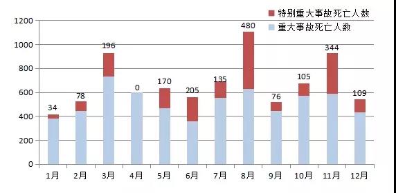 2009年至2018年,全國發(fā)生在8月份的重特大事故共54起、死亡1110人,占近十年重特大事故起數(shù)、死亡人數(shù)的11.0%、13.6%;分別比全年月平均值高出2.7和5.3個百分點,位列12個月份中的第二位、第一位。
