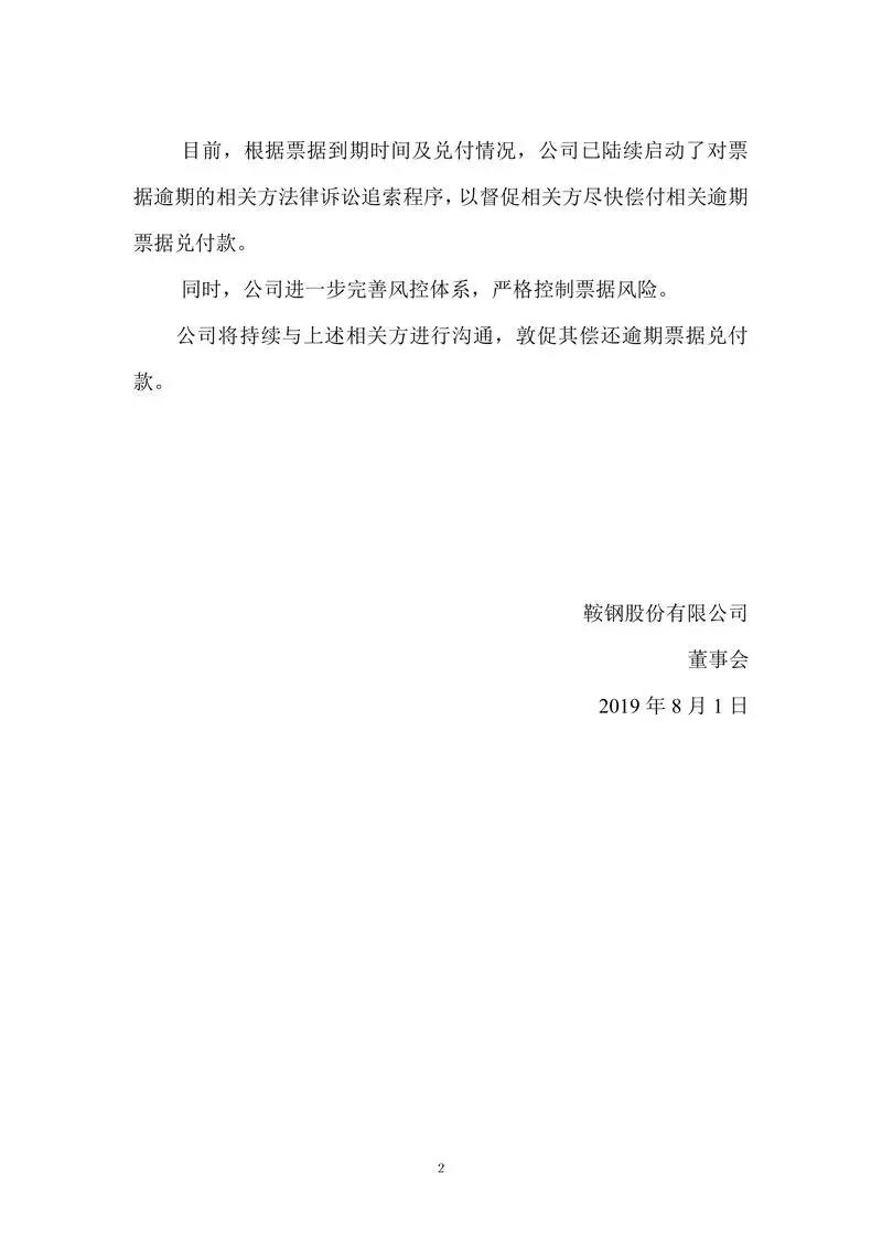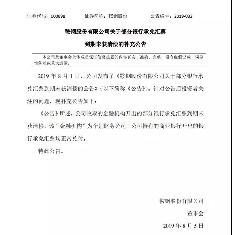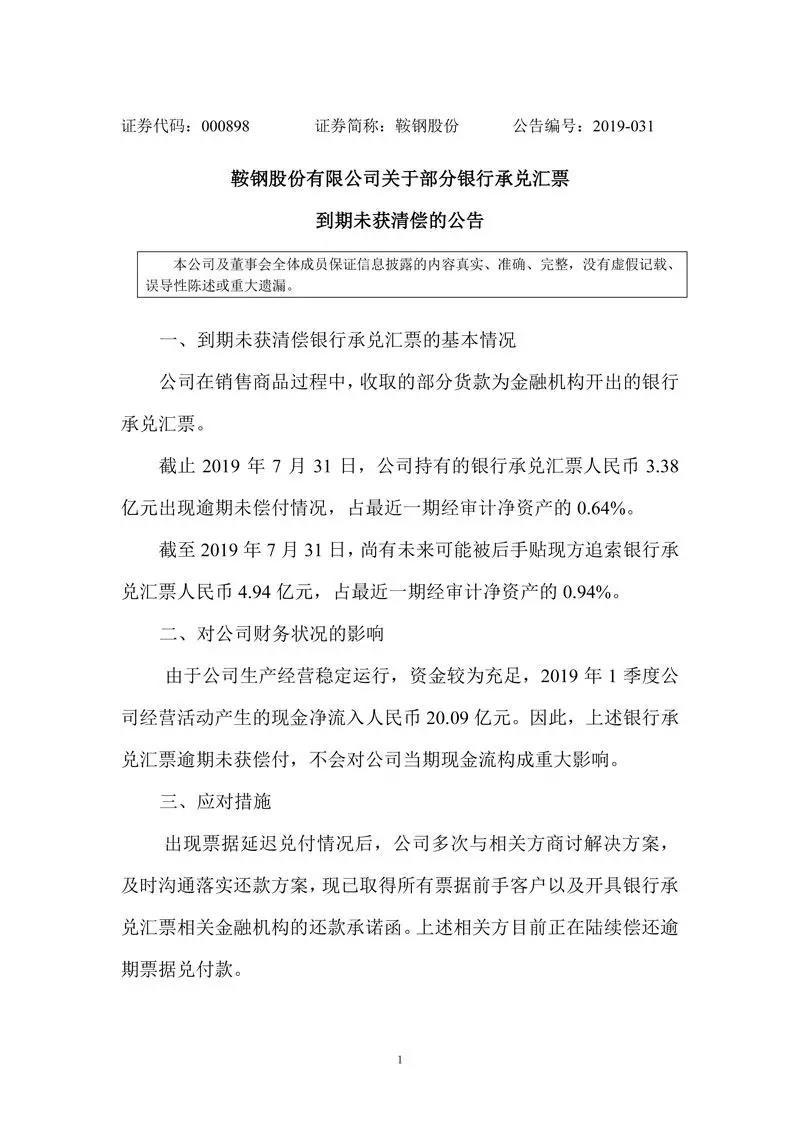 據水泥人網了解,鞍鋼股份日前發布的一則“部分銀行承兌匯票到期未獲清償”的公告迅速引發市場關注。截至7月31日,尚有未來可能被后手貼現方追索銀行承兌匯票4.94億元,兩者銀行承兌票據合計8.32億元。