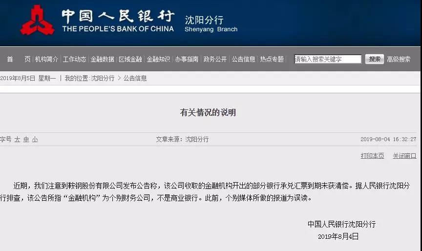 8月4日,央行沈陽分行緊急辟謠,經排查,該公告所指“金融機構”為個別財務公司,不是商業銀行。