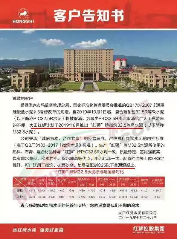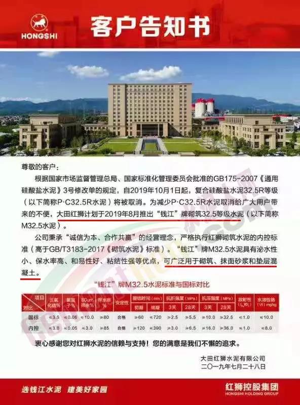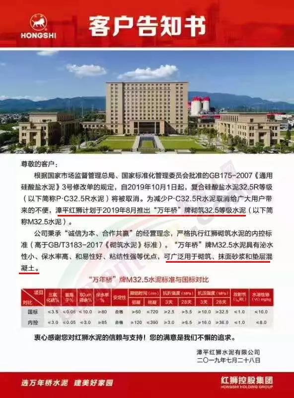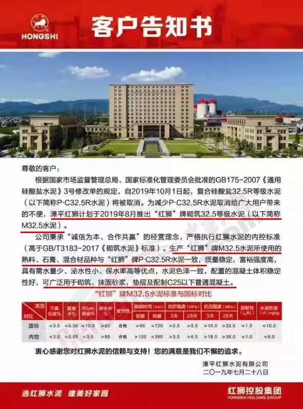 紅獅水泥福建區域大田紅獅和漳平紅獅等發布客戶告知書稱將于近期推出“紅獅”“錢江”、“萬年橋”品牌M32.5水泥。其中“紅獅”牌M32.5所使用的熟料、石膏、混合材品種與“紅獅”牌PC32.5R水泥一致。