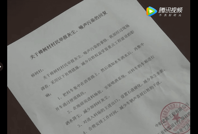 隨后,記者和劉碧云一起來到了湘蓮大道工程項目施工單位——中航建筑工程有限公司了解情況。中航建筑工程有限公司協調員黃輝亞告訴記者,在此之前,他們已經接到了劉碧云反映的一系列問題。公司也于7月31日出具了一份《關于樟樹村村民舉報灰塵、噪聲污染的回復》,經過現場調查,項目施工方將采取措施,減少工程施工對周邊群眾帶來的影響。