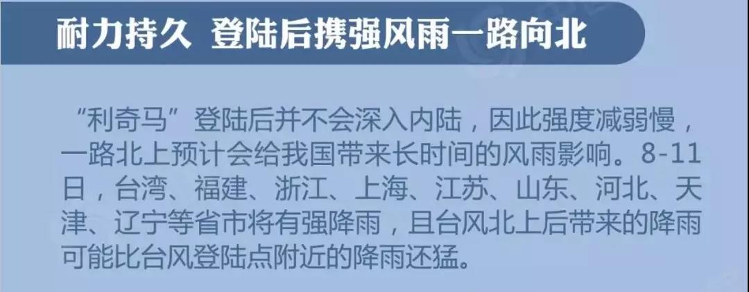 持續(xù)時(shí)間長——臺風(fēng)“利奇馬”未來登陸中國后,也并不會深入內(nèi)陸,強(qiáng)度減弱慢,比較有利于維持臺風(fēng)環(huán)流,一路北上預(yù)計(jì)會給中國帶來長時(shí)間風(fēng)雨影響。