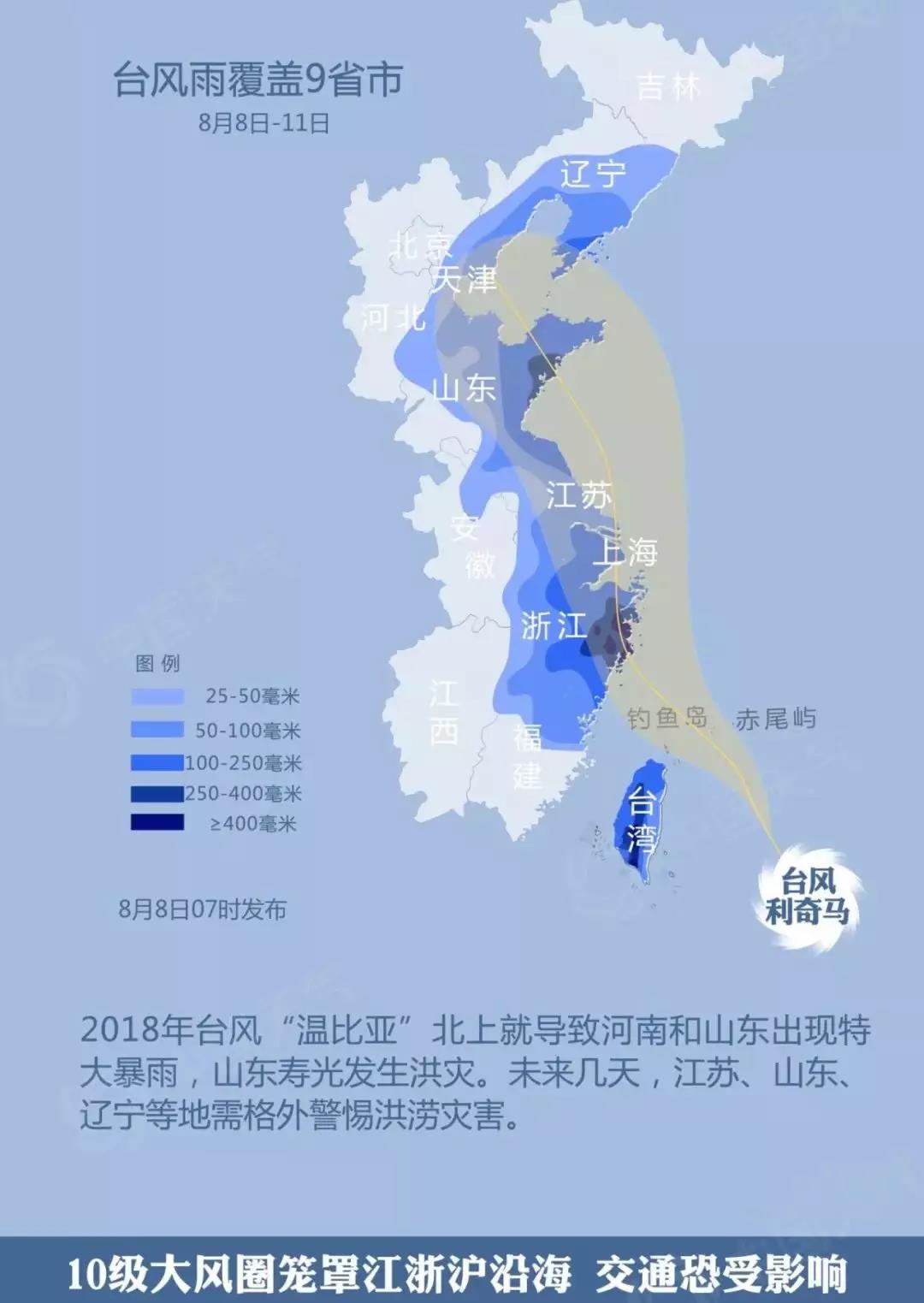 影響范圍廣——臺灣、福建、浙江、上海、江蘇、山東、天津、遼寧等8省市將受到臺風(fēng)直接影響。后期,臺風(fēng)和冷空氣結(jié)合還會給華北東部、東北等地帶來大范圍強(qiáng)降雨。