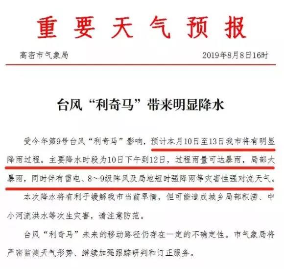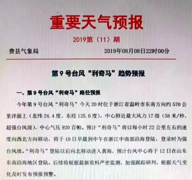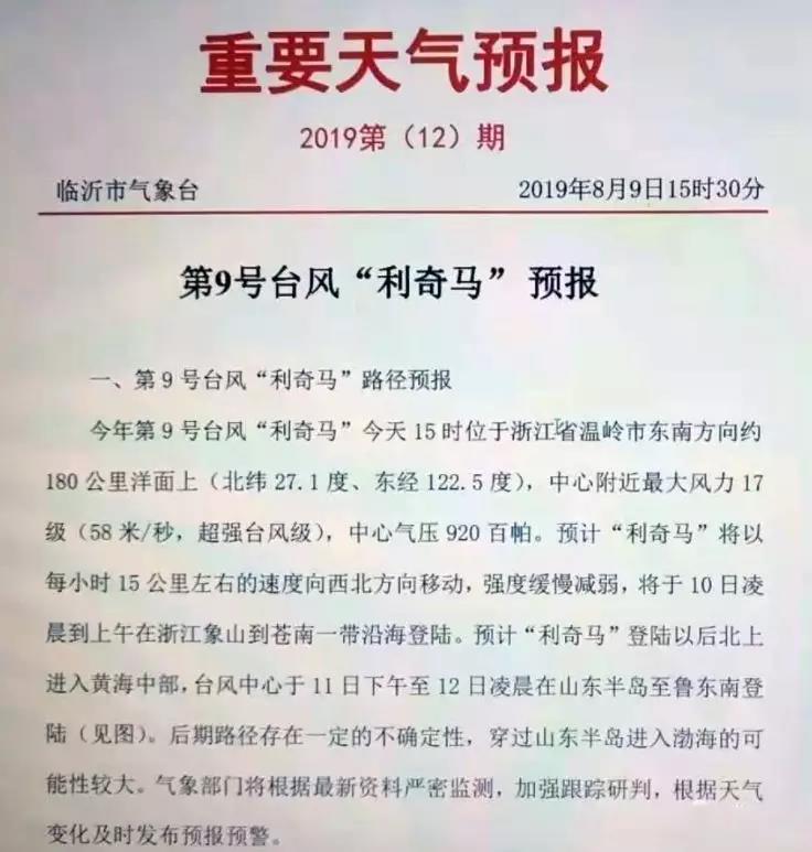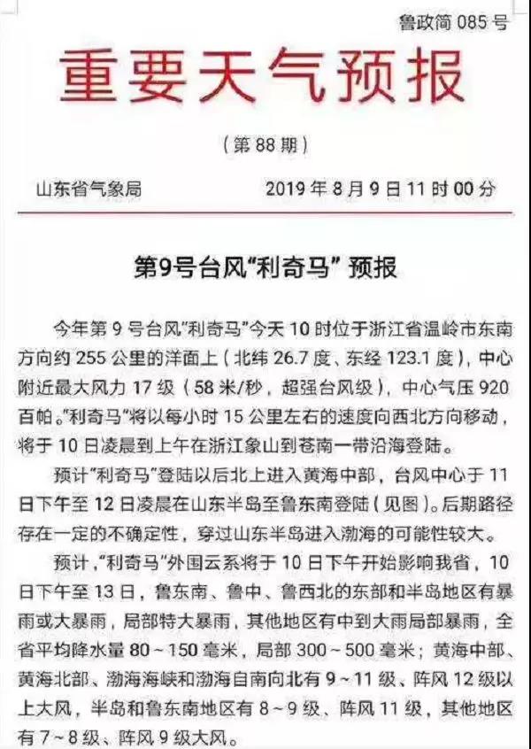 山東省氣象局發(fā)布第9號臺風(fēng)“利奇馬”預(yù)報(bào)稱,預(yù)計(jì)臺風(fēng)中心于11日下午至12日凌晨在山東半島至魯東南登陸。后期路徑存在一定的不確定性,穿過山東半島進(jìn)入渤海的可能性較大。預(yù)計(jì)“利奇馬”外圍 云“系于10日下午開始影響山東省。