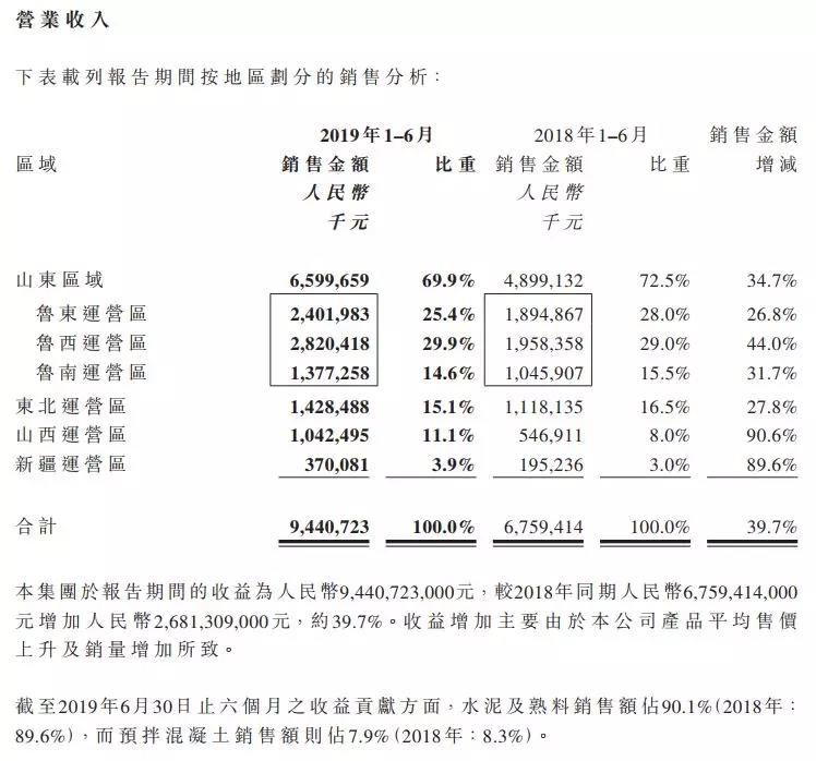 公告顯示,截至2019年6月30日,集團水泥產能1億噸,熟料產能5107萬噸,商品混凝土產能1930萬立方米。報告期內,集團銷售水泥、熟料合計2393.2萬噸,同比增加27.8%。