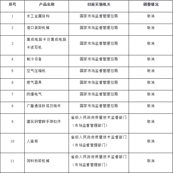 去年2018年9月末,國務院辦公廳曾發布《國務院關于進一步壓減工業產品生產許可證管理目錄和簡化審批程序的決定》并公布了《工業產品生產許可證取消、下放管理權限的產品目錄》和《調整后繼續實施工業產品生產許可證管理的產品目錄》。