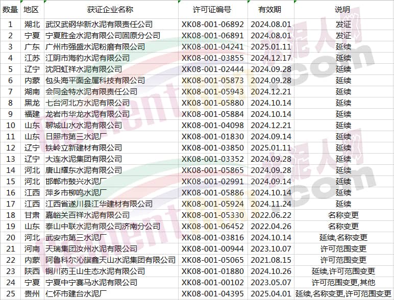 據查詢,8月1日至今全國工業產品生產許可證辦公室共發放水泥行業生產許可證的有25個編號,其中新發許可證企業2個編號,到期延續的18編號,涉及名稱和許可證范圍等變更共9個編號。