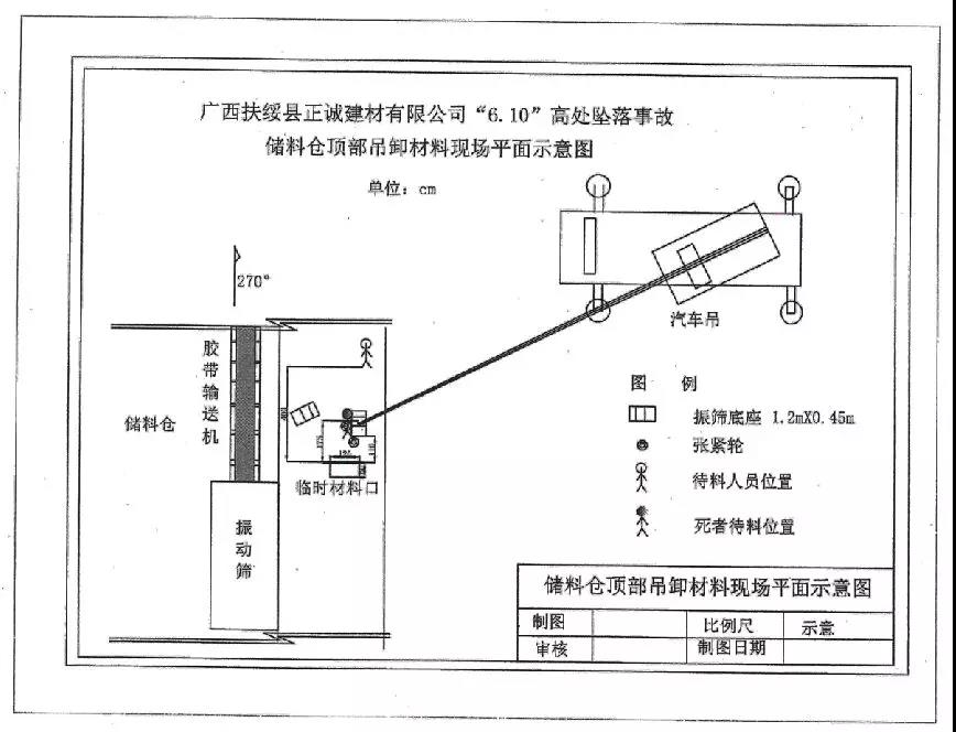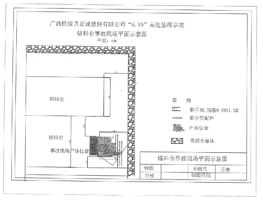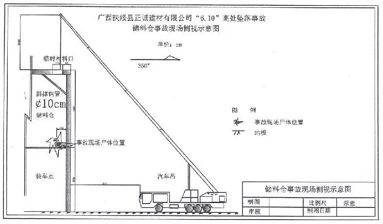 儲料倉事故現場平面示意圖 死者未戴安全頭盔,身上系有安全繩,衣著完整,外表沒有血跡。扶綏縣東門鎮中心衛生院出具的死亡證明是:顱腦外傷。