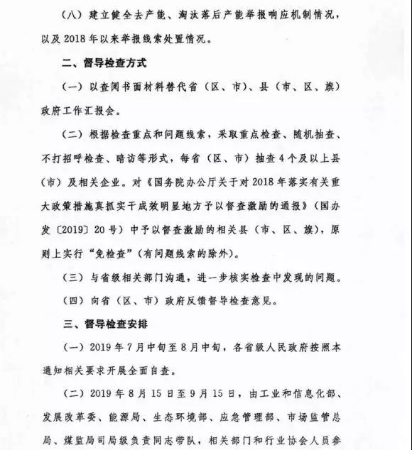 一、高度重視,落實責任。按照《通知》安排,8月15日至9月15日,淘汰落后和化解過剩產能國家督導檢查組將來我省開展工作督導檢查。國家督導檢查將以查閱書面材料代替政府 工作匯報會,并根據檢查重點和問題線索,采取重點檢查、隨機抽查、不打招呼檢查、暗訪等形式,抽查 4 個及以上縣(市、區) 及相關企業。請各地務必高度重視,嚴格落實地方政府工作責任, 按照《通知》要求,認真做好國家督導檢查各項準備工作。
