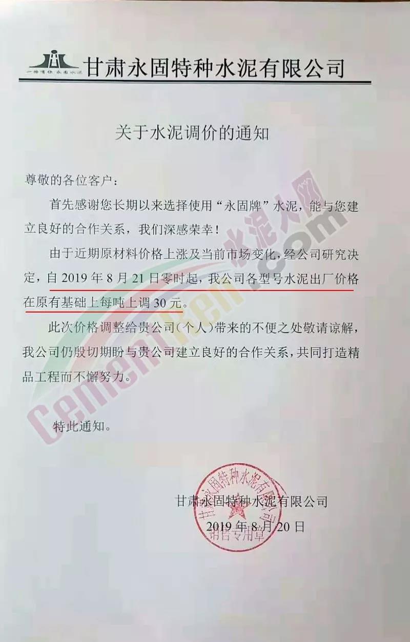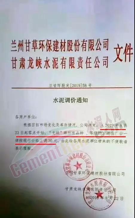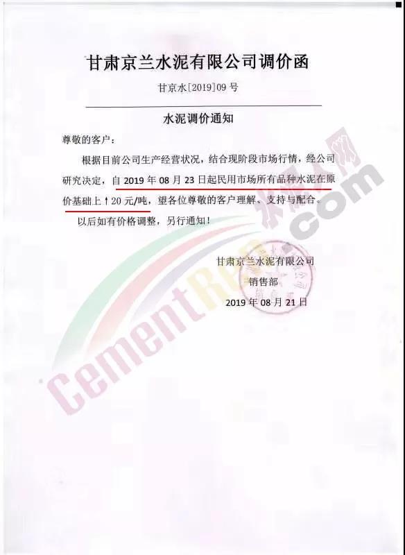 水泥人網通訊員消息:昨日(8月22日),皖北主導企業,相山海螺,宿州海螺,蕭縣天瑞等企業通知水泥價格在原價基礎上上調30元/噸。區域內其他也企業陸續跟漲,部分企業的通知函如下: 同期,甘肅蘭州及周邊區域企業自20日發布一波漲價通知后昨日又有多家企業陸續發出調價通知函稱上調水泥價格30元/噸。從各企業發布的通知函可見,白銀壽鹿山水泥、蘭州甘草環保建材、甘肅京蘭水泥、蘭州紅獅水泥等都是自今日起上調水泥價格。調價幅度均為20-30元/噸。